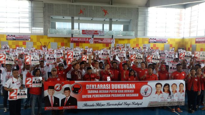 CIKARANG TIMUR – Giat kaderisasi Taruna Merah Putih (TMP) Kabupaten Bekasi yang dihadiri 250 kader TMP menyatakan deklarasi dukungan pasangan Tubagus Hasanudin dan Anton Charliyan amanah (Hasanah).