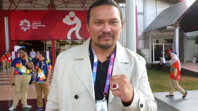 Martin Daniel dan staf MD Promotions usai menyaksikan pertandingan tinju Asian Games di Hall C, Kemayoran.