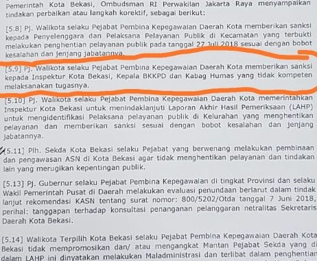 Menurut Teguh, hal itu harus menjadi pertimbangan dari tim Panitia Seleksi (Pansel). Pasalnya, pejabat yang terkena sanksi Ombudsman ikut seleksi calon Sekda Kota Bekasi.