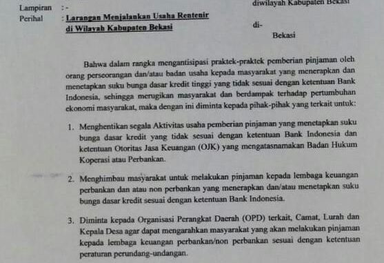 Surat tertanggal 29 Januari 2019 yang ditandatangani Plt Bupati Bekasi Eka Supria Atmaja tersebut berisikan larangan melakukan usaha rentenir di wilayah Kabupaten Bekasi.