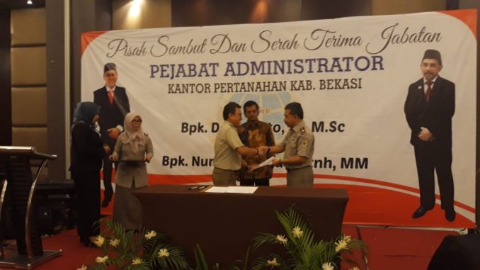CIKARANG SELATAN – Kepala Kantor Pertanahan Kabupaten Bekasi dari Deni Santo resmi diserah terimakan kepada Nurhadi Putra. Prosesi serah terima jabatan dipimpin langsung Kepala Kantor BPN Wilayah Jawa Barat, Yusuf Purnama.