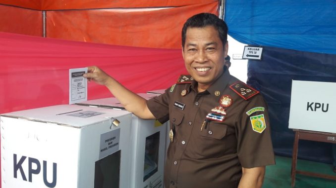 CIKARANG UTARA-Tak ingin ketinggalan berpartisipasi dalam menyukseskan Pesta Demokrasi Pemilu 2019, Kepala Kejaksaan Negeri (Kejari) Cikarang Risman Tahrioran manfaatkan sidak ke TPS sekalian mencoblos. Di TPS 30 Perumahan Puri Mutiara Cikarang, Desa Karang Harja, Kecamatan Cikarang Utara, dengan membawa surat formulir (form) C5.