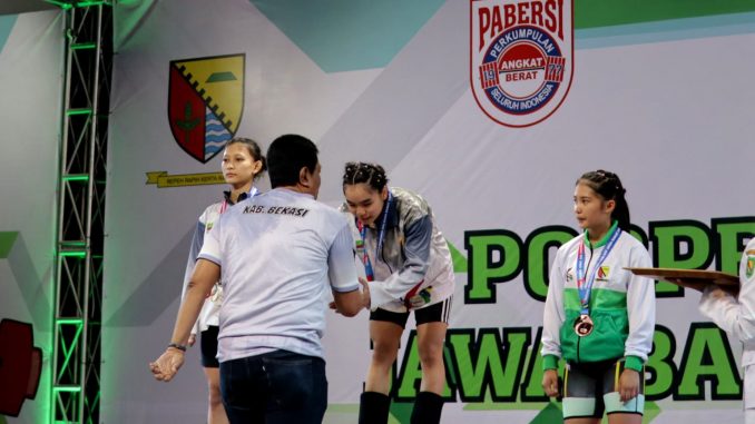 KABUPATEN BANDUNG – Atlet angkat besi Kabupaten Bekasi menyumbangkan satu medali emas dan satu medali perak di kelas 45 kilogram putri pada Porprov Jabar XIV 2022 di Gymnasium SOR Si Jalak Harupat, Kabupaten Bandung, Kamis (10/11/2022).