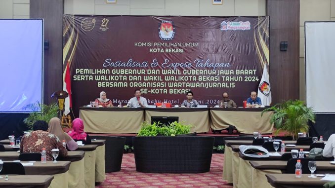 RAWALUMBU – Komisi Pemilihan Umum (KPU) Kota Bekasi menghelat sosialisasi expos tahapan pemilihan Gubernur dan Wakil Gubernur Jawa Barat serta Wali Kota dan Wakil Wali Kota Bekasi tahun 2024, bersama awak media setempat di Hotel Merapi Merbabu.